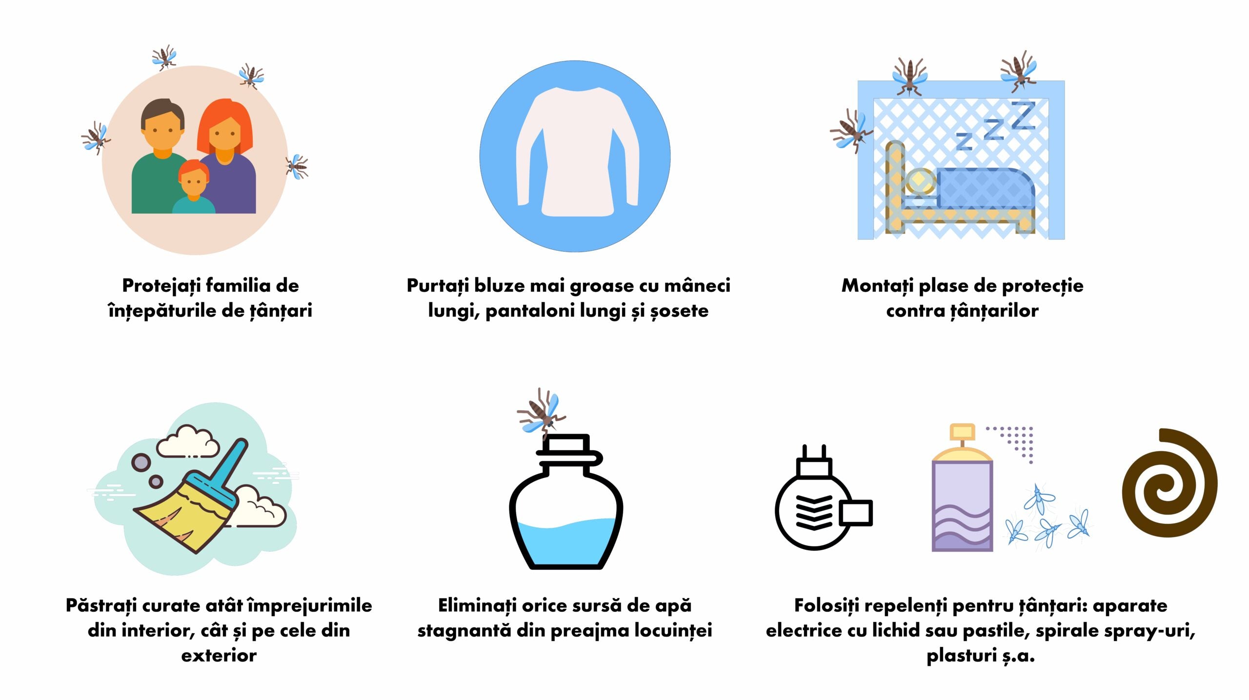 Este indicat să eliminăm orice sursă de apă stagnantă din preajma locuinței și să îndepărtăm gunoiul menajer. Ferestrele și ușile locuințelor trebuie să aibă montate plase de protecție contra țânțarilor. Utilizează și în interiorul locuinței produse repelente contra țânțarilor (aparat electric cu lichid sau capsule, spirale, lumânări sau uleiuri aromatice pe bază de lavandă, ulei de crizantemă, eucalipt).