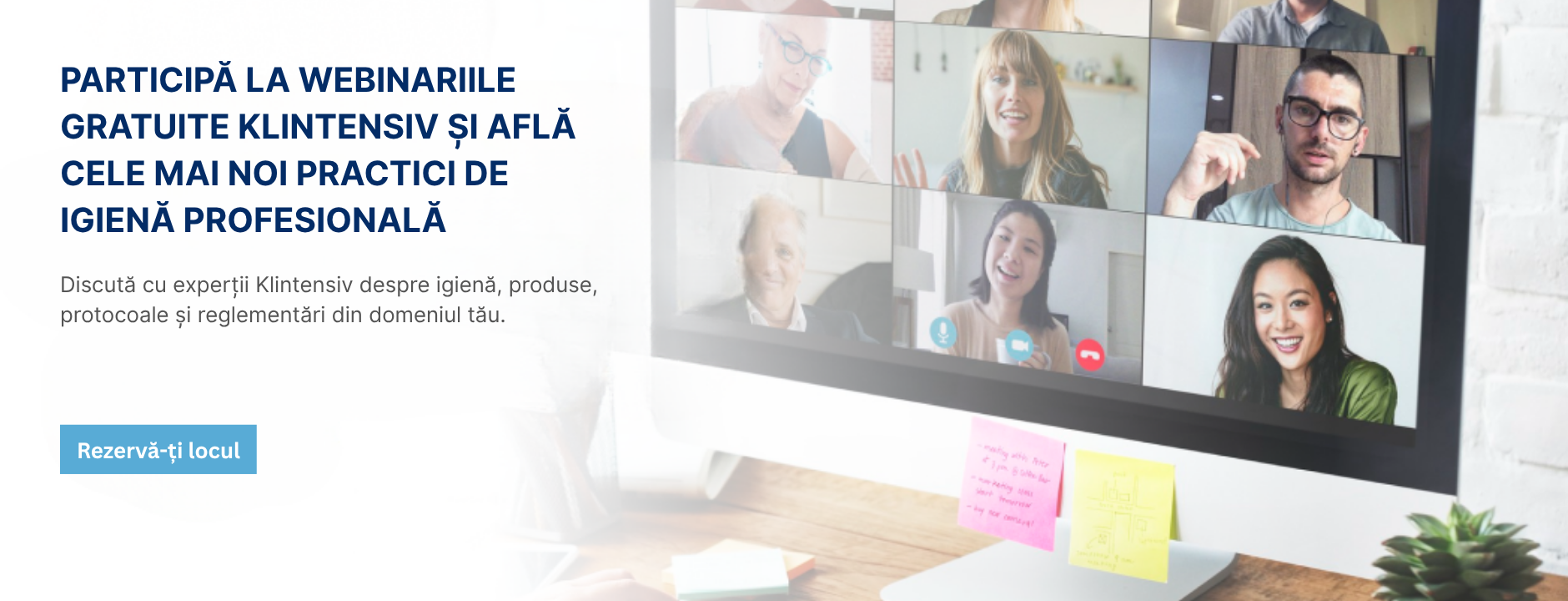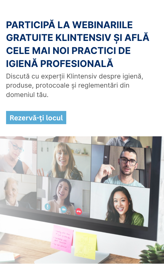 Rezervă-ți loculWebinariile sunt sesiuni live de 30–45 de minute, în care experții Klintensiv explică cele mai importante inovații și cele mai bune practici în igienă. Urmate de o sesiune Q&A live.